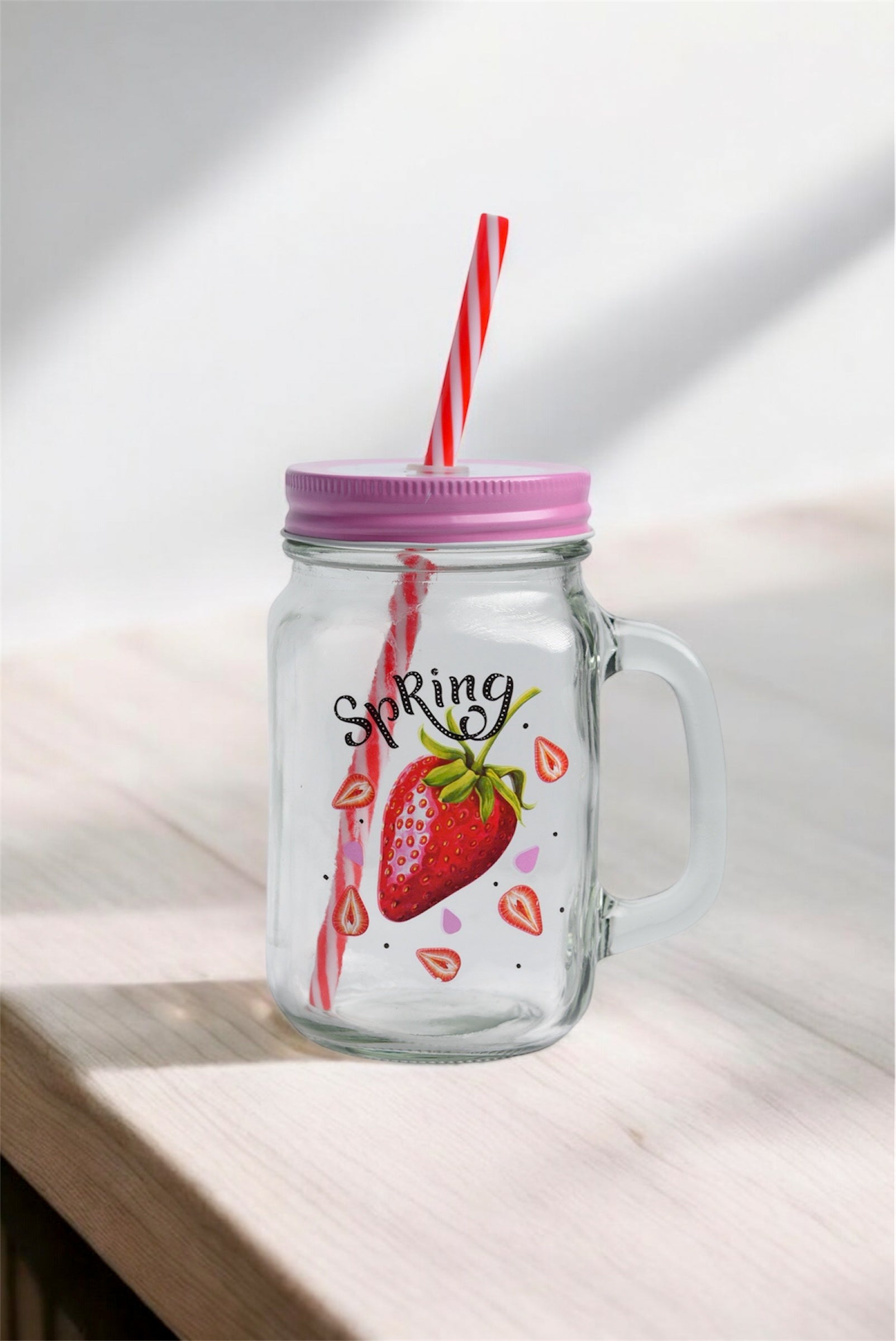 Fun Fruit printed glass mason jars are great for fruit infused water. The glass mason jar with handle will be come a new favorite for adults and kids alike.